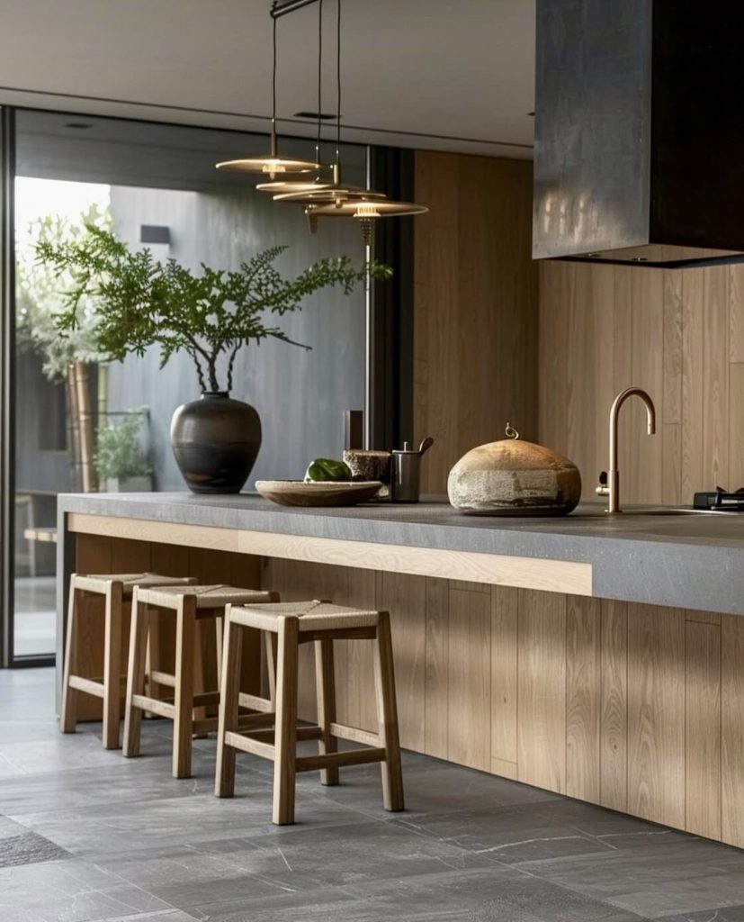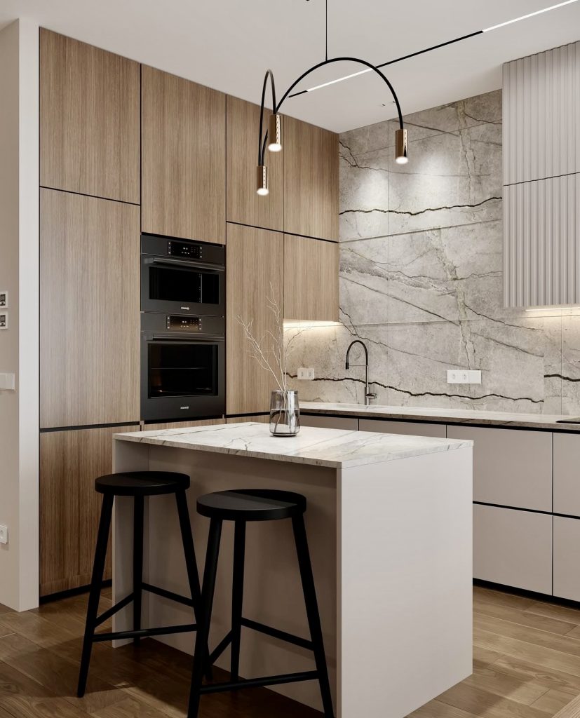 18. Modern Minimalist Kitchen with Stone Textures and Soft Wood