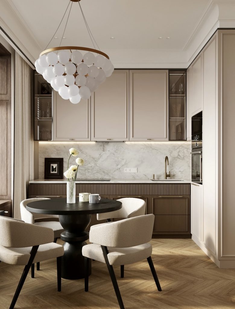 The design inspiration from this space lies within its soft luxury look that has managed to infuse the whole area with its desirable beige color with marble finishes that symbolize luxury in 2026 perfectly. The dramatic chandelier light adds to the luxury feel that is there within this space without making it look dated. The round dining chairs and dark dining table are perfect additions to this luxury look, as they ensure that this area has managed to retain its coziness perfectly. The inspiration behind this design lies within the current trend that is leaning more towards the warmth that neutrals possess without losing their luxury feel.