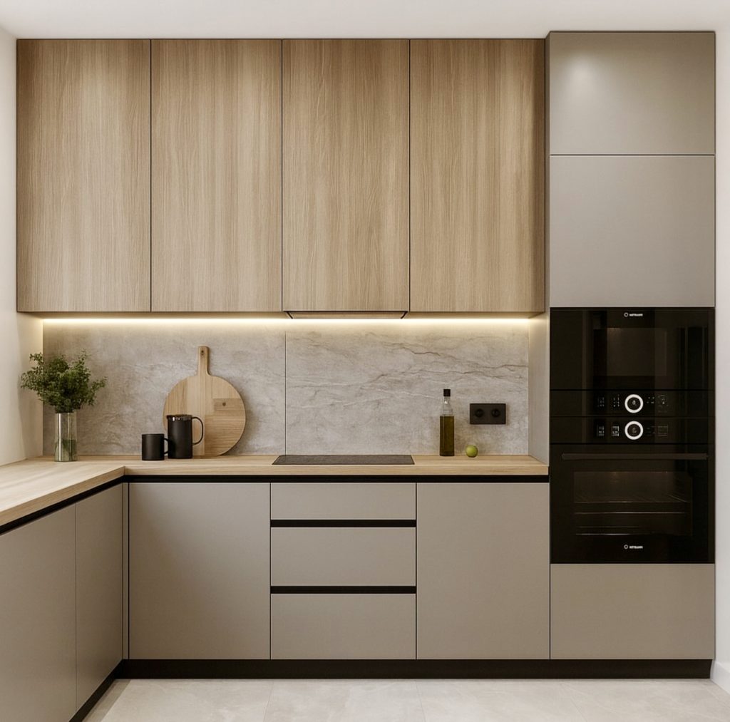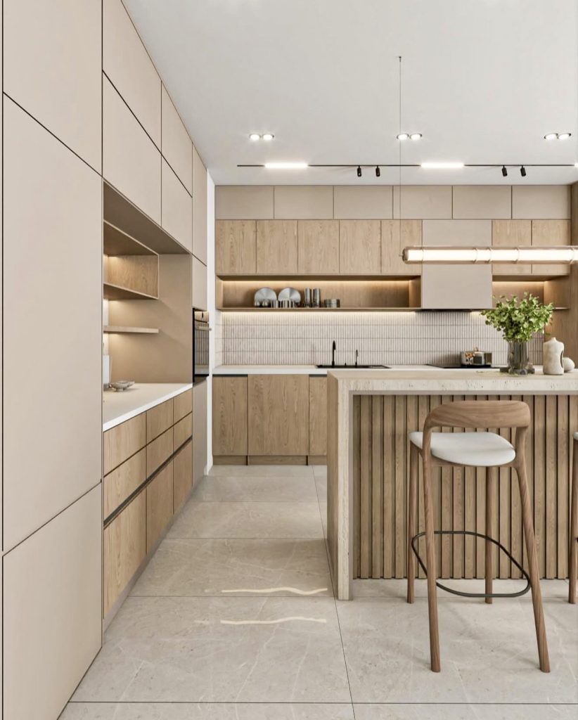 This design embraces luxury beige tones that instantly make the kitchen feel calm, airy, and timeless, fitting perfectly into modern open-concept homes. Clean-lined cabinetry and soft LED lighting give the space a subtle glow, echoing design movements seen in upscale European interiors. The mix of warm wood and smooth beige panels creates a minimalist composition that feels both simple and expensive, aligning beautifully with Luxury 2026 trends. An elegant island adds structure to the layout, making it ideal for cooking, hosting, or working from home. Homeowners looking for elevated but approachable ideas will find this palette especially inspiring.
