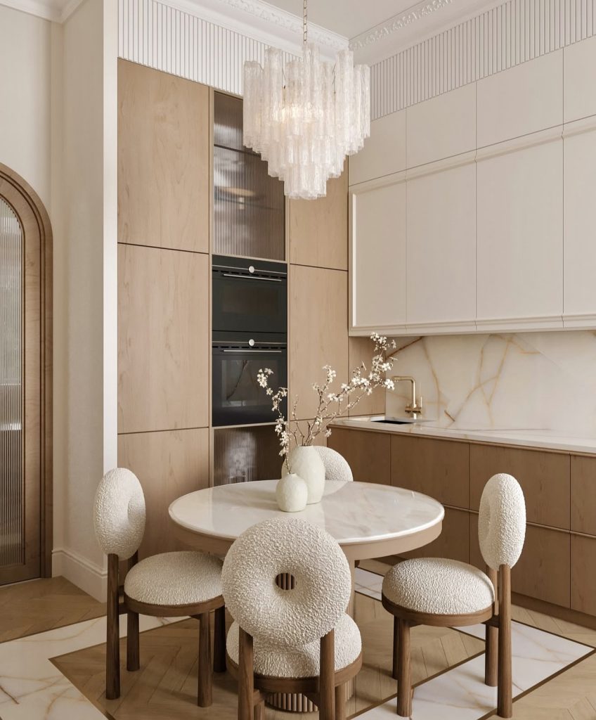 This kitchen balances soft minimalism with elegant warmth, combining creamy cabinetry and rich wood accents that align beautifully with 2026 trends. The sculptural chandelier introduces a sense of modern luxury, giving the space a distinctive yet effortless character. Clean lines and integrated appliances keep the room feeling airy and uncluttered, offering ideas that work well for both city apartments and suburban homes. The rounded dining chairs add comfort and sophistication, reflecting the shift toward softer silhouettes in current interiors. It’s a serene, stylish setting that blends understated elegance with everyday practicality.