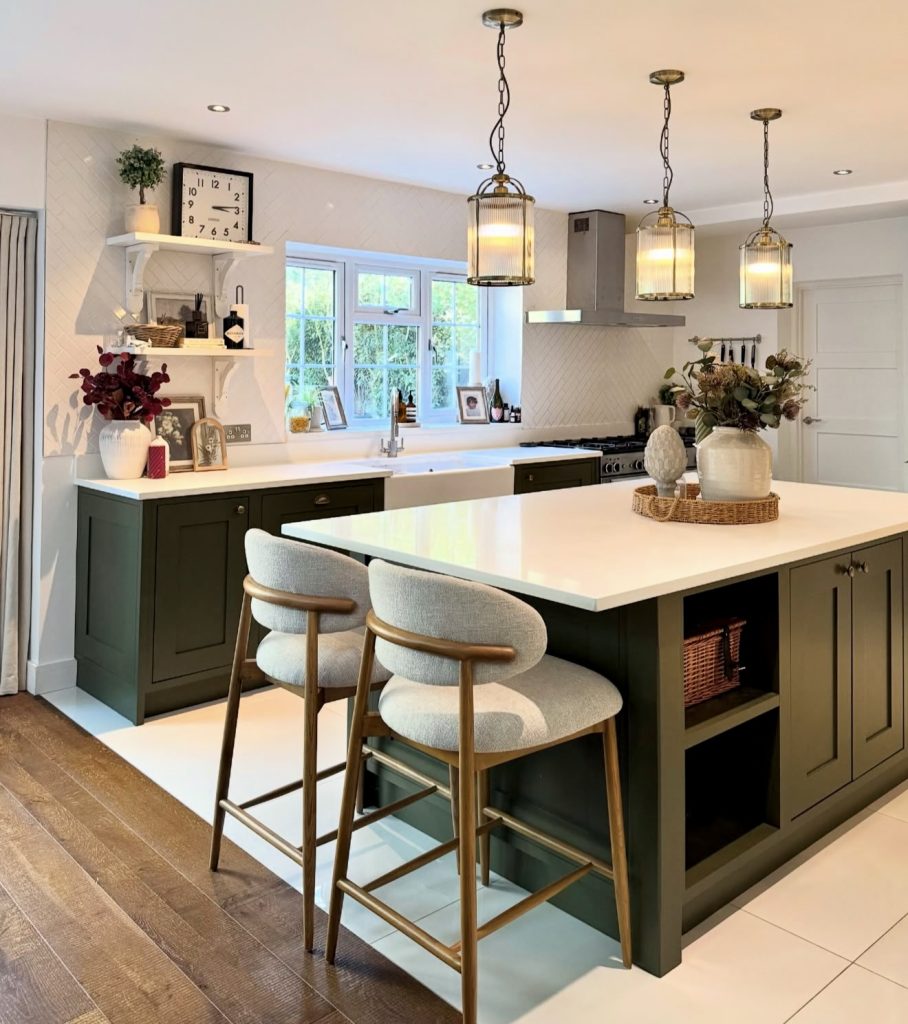 This kitchen pairs deep green cabinetry with warm brass accents, creating a timeless look that resonates with homeowners who appreciate both tradition and modern comfort. The oversized island offers practical workspace while reinforcing the open-concept feeling that many 2026 homes embrace. Lantern-style pendant lights add a touch of nostalgic charm, subtly elevating the room with a hint of luxury light color ambiance. Thoughtful décor and curated shelf displays bring personality, grounding the design in lived-in warmth. It’s a beautiful example of how classic character can be refreshed to match today’s design ideas.