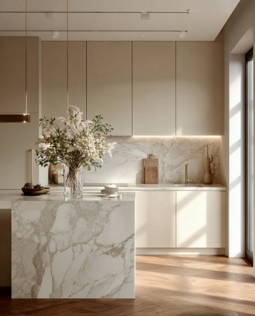 This kitchen embodies soft luxury beige styling, with its veined marble surfaces and warm, creamy cabinetry that create an inviting and elevated atmosphere. Slim gold accents add a hint of luxury without overpowering the calming palette, making the space feel refined yet relaxed. The waterfall island stands as a sculptural centerpiece, offering homeowners inspiring ideas for modern multifunctional layouts. Under-cabinet lighting highlights the natural textures, aligning with the softer, warmer lighting direction leading 2026 trends. It’s a harmonious kitchen perfect for those seeking tranquility paired with high-end detail.