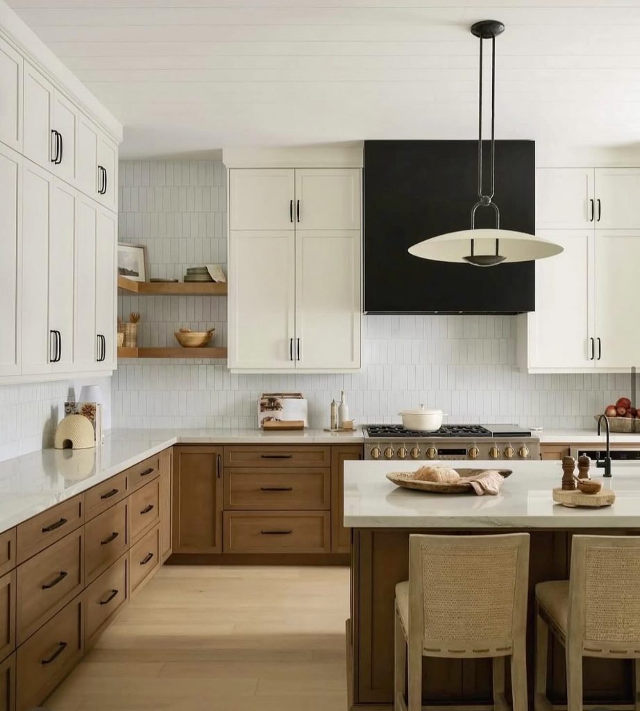 This kitchen blends white natural wood cabinetry with warm oak tones, creating a balanced transitional look that feels inviting and timeless. The bold black range hood adds a modern edge, aligning with 2026 trends that celebrate strong contrast and clean architectural lines. Soft shelving moments and warm textures give the space a comfortable, lived-in feel while keeping the design elevated. The light wood flooring supports a calm, airy mood that works beautifully in both small and open suburban homes. It’s an excellent example of how thoughtful details create modern ideas that remain practical for everyday cooking and gathering.