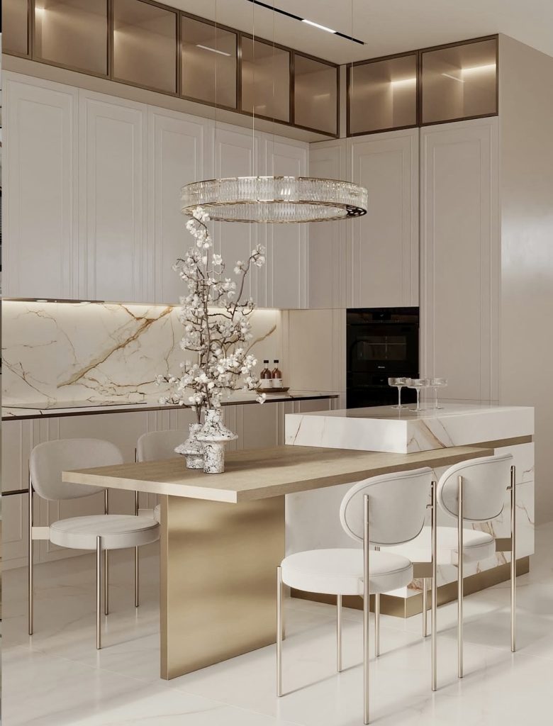 This kitchen leans fully into Luxury 2026 aesthetics, combining creamy cabinetry with bold gold accents and polished marble finishes. The illuminated upper cabinets introduce a soft glow that enhances the sophisticated palette, making the entire room feel both glamorous and welcoming. The integrated dining extension is a clever design move, perfect for homeowners looking for ideas that maximize functionality without sacrificing elegance. Curated florals and sculptural décor align with upscale interiors showcased by leading design tastemakers. It’s a luxurious space designed for those who value beauty, refinement, and modern comfort.