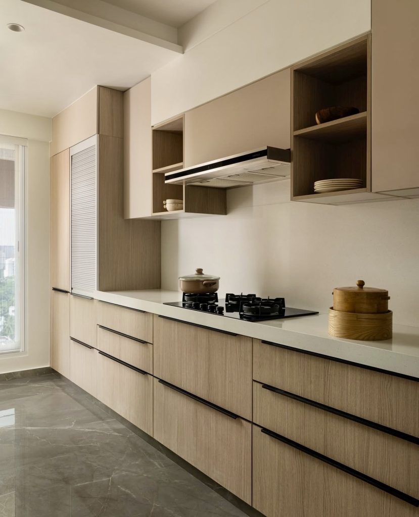 This minimalist kitchen embraces warm wood cabinetry and soft beige tones, creating a peaceful backdrop that fits beautifully into a simple modern design direction. Clean black hardware introduces subtle contrast while maintaining the calm, understated palette that dominates 2026 style preferences. Open shelving pockets add thoughtful functionality, giving homeowners accessible space for everyday dishes and essentials. The linear cabinetry layout is ideal for maximizing usability in compact or elongated spaces, offering smart ideas for practical living. It’s a serene design that blends quiet luxury with effortless organization.
