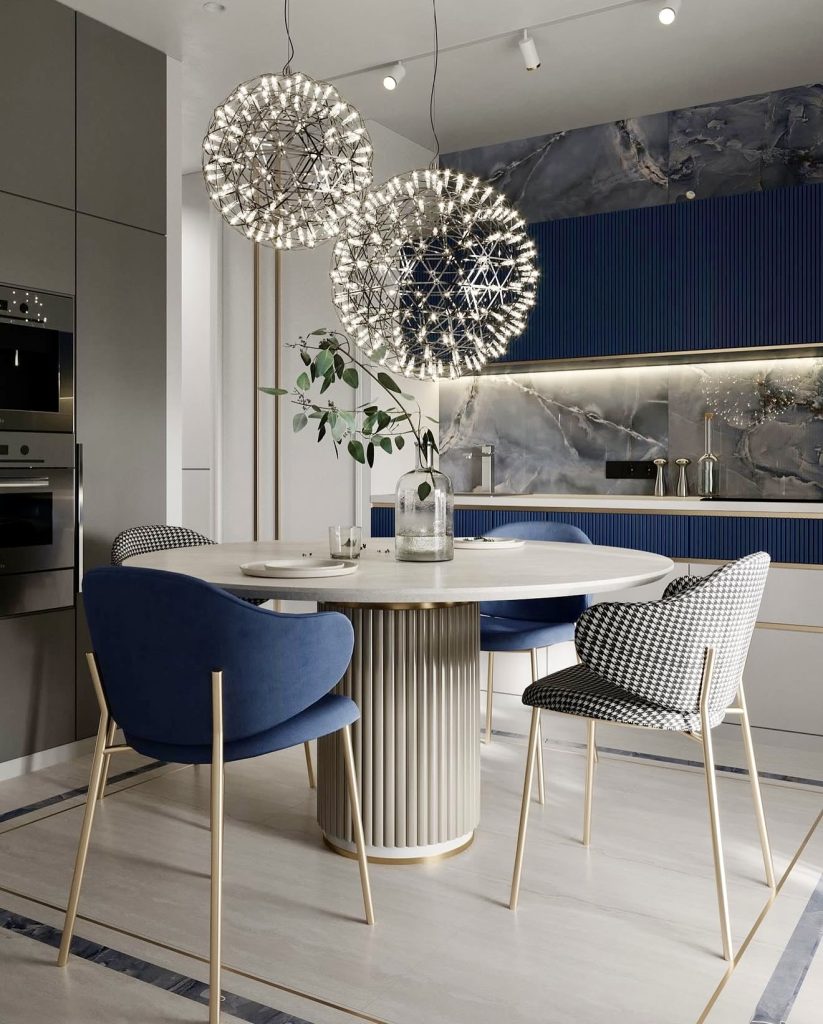 This kitchen brings a bold, contemporary edge with deep blue cabinetry paired with dramatic sculptural pendant lights that instantly command attention. The marble-inspired backsplash introduces a layer of high-end texture aligned with Luxury 2026 black and jewel-tone trends. Gold and cream details soften the intensity of the blue, creating harmony that feels both modern and elegant. The rounded dining table and mixed-fabric chairs highlight a growing interest in expressive, curated interiors. It’s a standout space for homeowners who want ideas that blend creativity with upscale modern living.