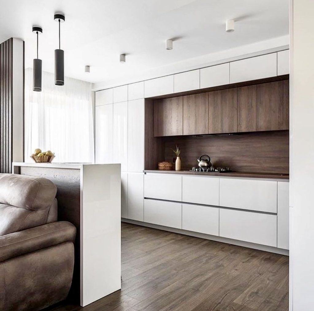 The inspiration behind this modern kitchen is ideal since it combines clean white cabinetry with wood accents that are symbolic of transition as opposed to modernity. The recessed area surrounding the cooktop ensures seamless transitions between the upper and lower cabinetry storage that has proven to be popular in 2026 designs. The dark pendant lights are ideal since they ensure that the interior space still maintains an element of calmness even with the deep-color accents. The ample space ensures that it offers ideal inspiration to resident owners who want to design apartments or condos in the suburbs that are sleek and minimalist.