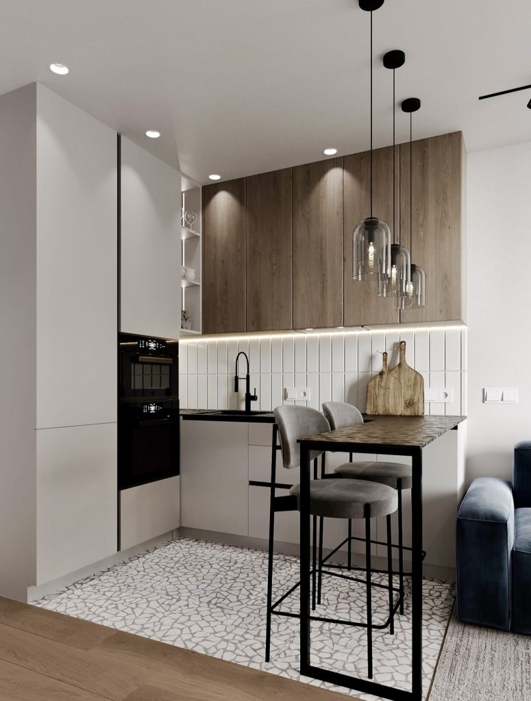 This ideal compact modern kitchen features an efficient L-shaped layout with wood cabinetry and matte black finishes that are symbolic of modernism. The rather soft cabinetry lighting ensures that the resident owner maintains an element of coziness that is reflective of the entire interior space. The higher dining table ensures that it is utilized as an ideal multifunctional space that shows just how compact living has evolved as an ideal 2026 design element. The textured flooring is rather personalized without affecting the clean cabinetry lines that are symbolic of modern minimalist design.