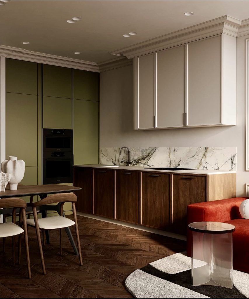 This mixed media kitchen combines rich wood with calm beige above lower cabinetry to produce an earthy yet upscale color scheme that appeals to the tastes for luxury lights. The marble backsplash provides artistic movement to deepen the entire design feel. Green storage provides an artistic pop with subtle nods to the influences that drive 2026’s natural tone designs. The dining area that follows demonstrates just how perfectly modern interiors blend kitchens and living areas within smaller living environments. It’s an artistic expression that appeals well to those who feel most comfortable with artistic expression within those modern interiors.