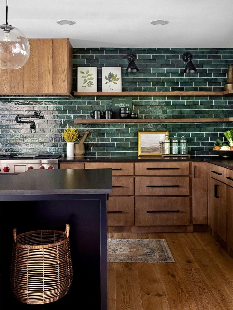 This kitchen brings a dramatic pop of color with dark green tile, delivering that signature mid-century flair that’s making a comeback in 2026. The warm wood cabinetry balances the bold palette, creating an inviting and visually rich environment that feels both nostalgic and modern. Matte black light fixtures and hardware give the space a contemporary edge, aligning with the popularity of Luxury 2026 black styling. Open shelving introduces opportunities for curated decor moments, perfect for anyone browsing Pinterest for inspiration. It’s a standout design for homeowners who want personality, texture, and artistry woven into their daily routine.