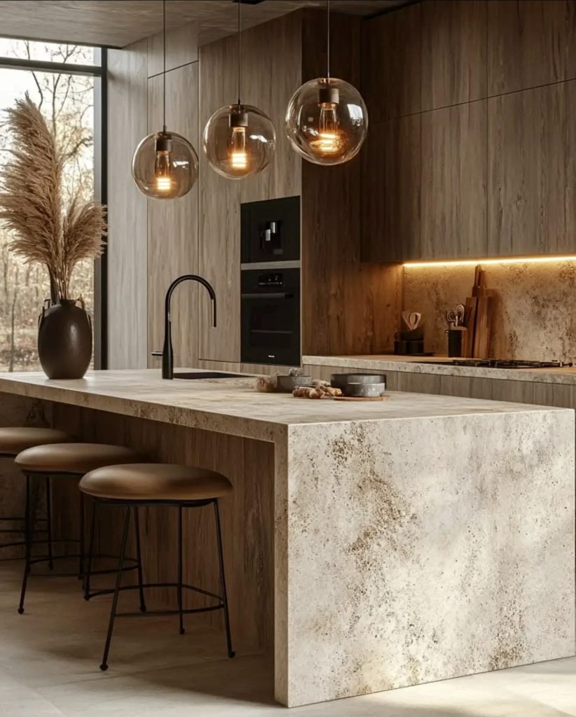 This kitchen embraces a richly layered aesthetic where warm wood cabinetry meets a dramatic stone waterfall island, creating a look that feels deeply luxurious yet effortlessly natural. The soft ambient lighting under the cabinets enhances the organic textures, a subtle detail often highlighted by designers pushing 2026 trends toward warmer, more tactile finishes. Rounded pendant lights bring a sculptural elegance, adding a touch of Luxury 2026 Black through the sleek faucet and hardware. The combination of earthy stone and minimalist lines makes this space ideal for homeowners wanting refined ideas that still feel grounded. It’s a perfect example of how modern kitchens in 2026 blend sophistication with quiet comfort.
