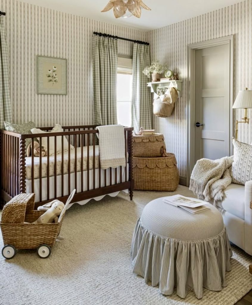 It offers a timeless cozy charm of a nursery with striped wallpaper, soft curtains, and a dark wooden crib. The look feels all neutral, so it’s an ideal choice for a gender-neutral or unisex style parents can enjoy for many years to come. Wicker baskets and soft blankets plus many layers and textures add to its earthy warmth. Toy stroller and simple wall art make it cute yet personal. The space feels classic, yet there is a unique twist to it, and is perfect for families who appreciate vintage-inspired design. A splash of green with plants or flowers would be a wonderful touch.