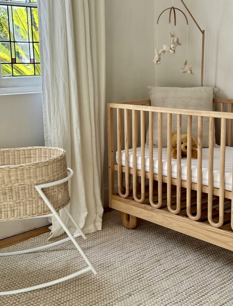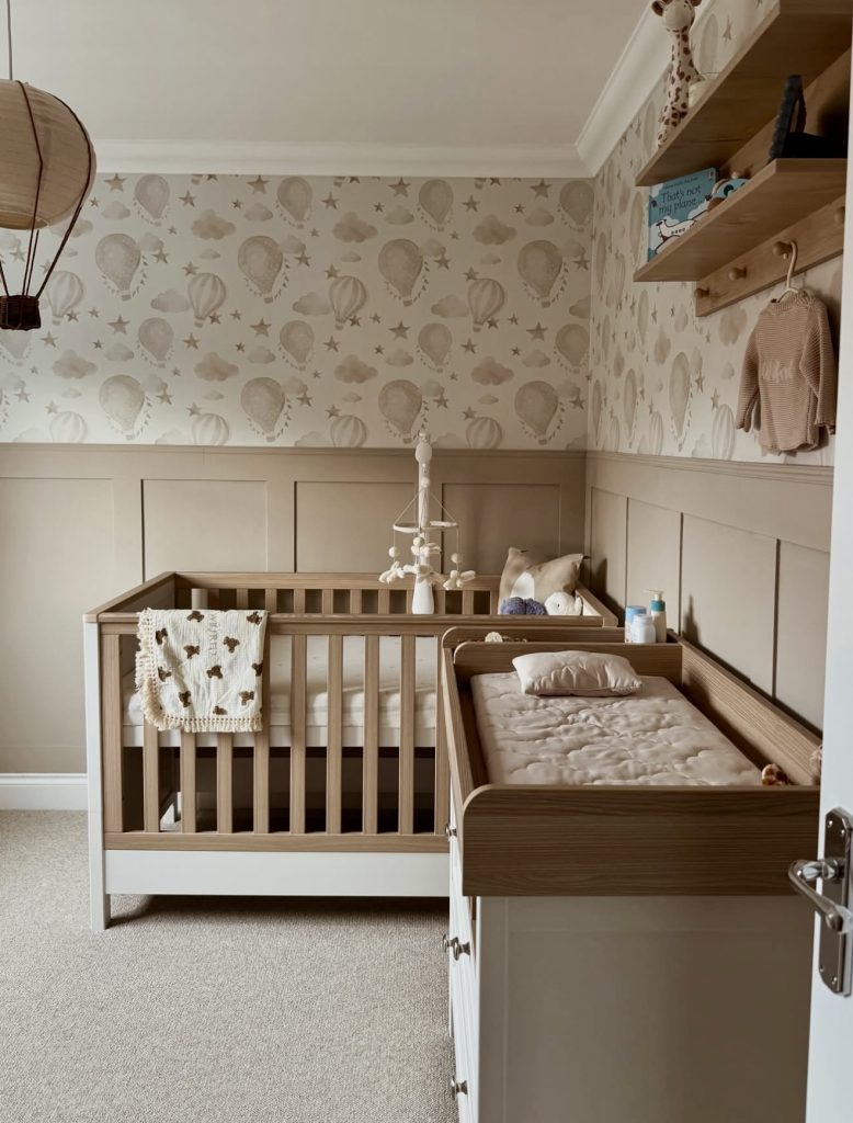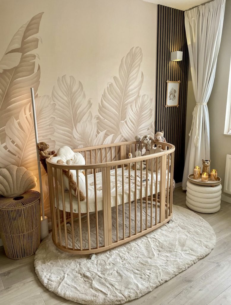 The giant leafy mural and round wooden crib are all about whimsical adventure. It keeps a neutral earthy palette with the intense wallpaper, giving just a hint of adventure. Soft lighting, cuddly toys, and rounded textures make it as cosy as one can get. It definitely can go into jungle or forest theme, which definitely stays in trend in 2026. The crib’s unique shape combined with natural accents adds to its charm and modern outlook. Parents keen on having a truly unique and stylish nursery would find some inspiration here.
