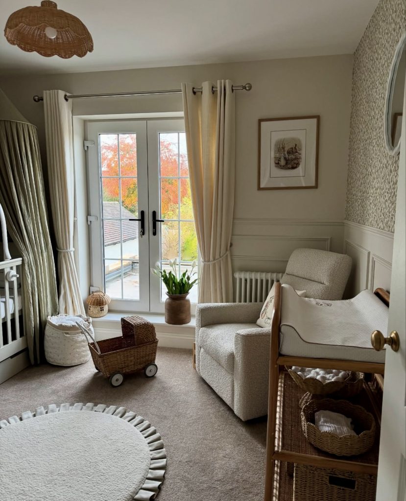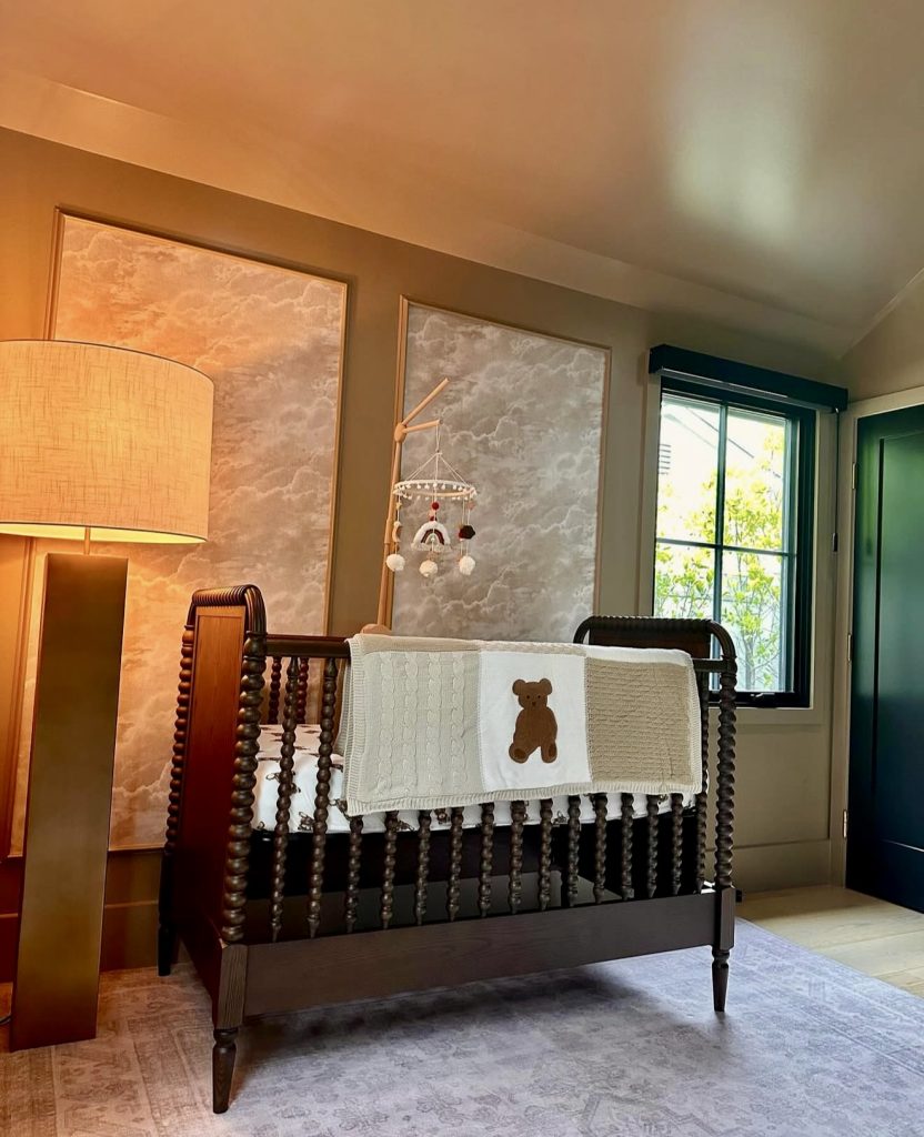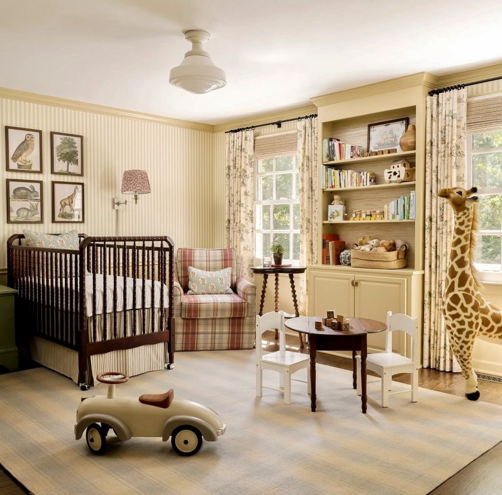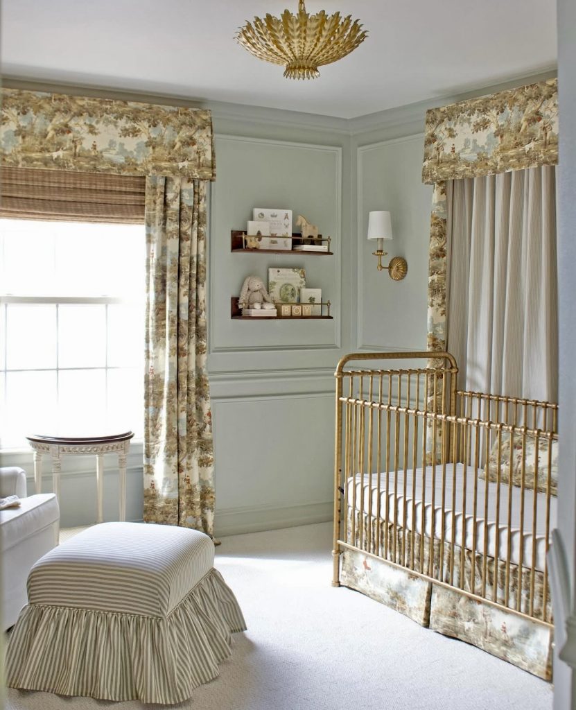 This nursery leans into tradition with patterned drapery, paneled walls, and a vintage-style gold crib. The muted palette feels neutral but still has a unique richness that feels refined. The floral prints and matching textiles create a sense of cozy harmony. A striped ottoman and carefully curated shelves add both comfort and function. The design could suit a church-like or classic American home setting beautifully. It shows how nursery ideas 2026 can balance elegance with child-friendly details.