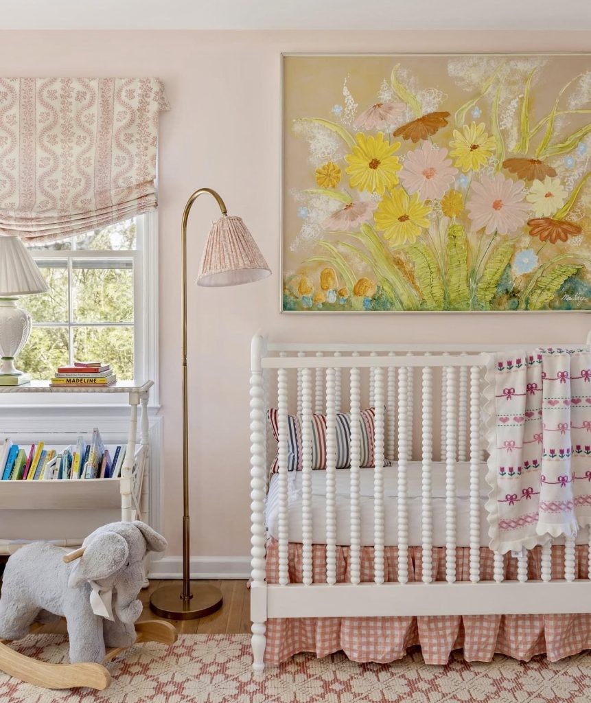 This nursery feels uplifting and joyful with its blend of pink and yellow accents. Floral artwork adorning the wall provides a colorful and whimsical touch that sets the tone for the space. A spindle crib with checked linens embodies charming traditional elements that parents can cherish. The soft pastel palette renders it more or less neutral, capable of growing with the child. The patterned curtains along with the rug create depth without obstructing the room. This design is just perfect for families who are into unique and vintage-inspired interiors.