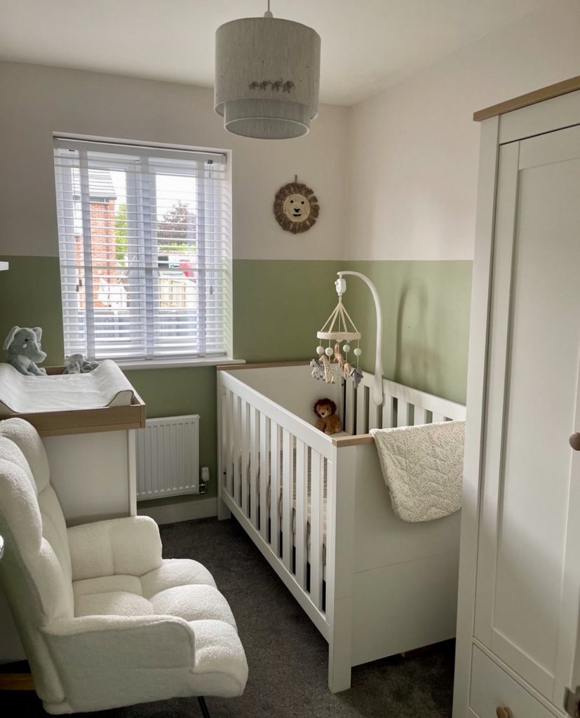 This nursery showcases the beauty of green paired with crisp white for a fresh, neutral look. The two-tone wall design makes the room feel taller and more spacious. A simple crib and soft armchair ensure the space stays cozy and functional. Minimal decor, like a lion wall piece, adds a cute and whimsical element. The overall style works perfectly for a gender neutral or unisex nursery. It’s proof that clean lines and an earthy palette can be both stylish and calming.