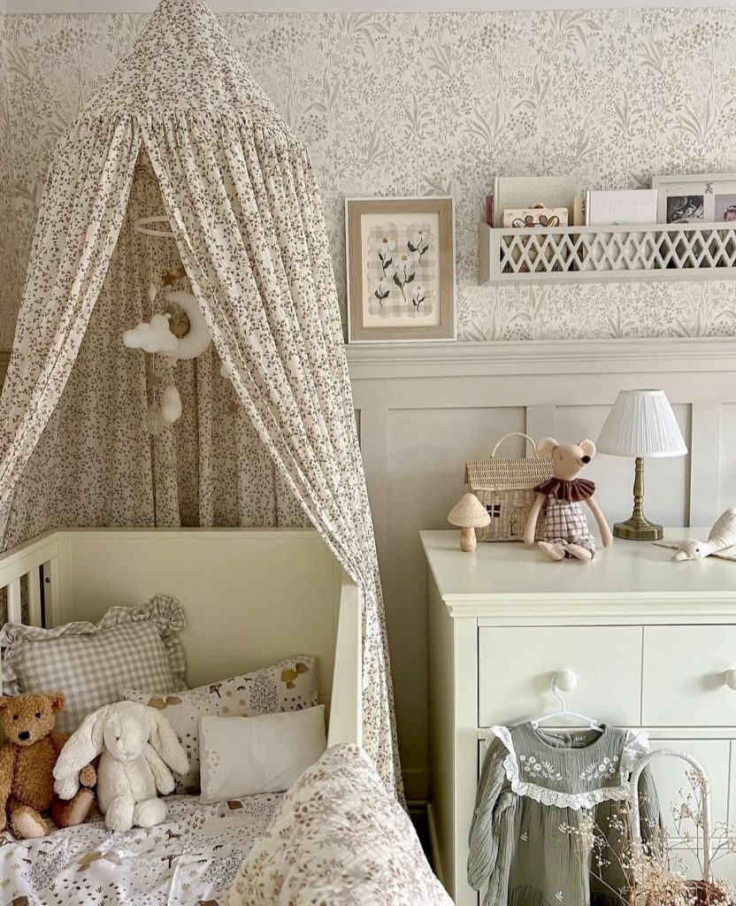 This design leans into whimsical storytelling with a soft canopy draped over the crib. The muted floral wallpaper and matching textiles create a cozy and neutral base. Plush toys and handpicked decor details add a cute personality to the space. The look feels timeless, making it ideal for a gender neutral nursery that still feels unique. Earth-toned accents and woven baskets bring a subtle earthy vibe. Parents who want a touch of romance in their nursery will find inspiration here.