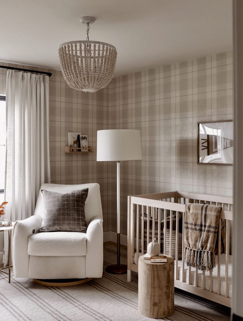 This nursery creates a warm, cozy atmosphere with plaid wallpaper and soft beige tones. The light wood crib and matching textures keep the design neutral and versatile. A shearling chair and layered textiles add comfort and practicality for everyday routines. The space feels slightly earthy, yet polished enough for a unique take on tradition. It’s a gender neutral design that blends modern and classic elements beautifully. The overall look is calming, perfect for a restful nursery environment.