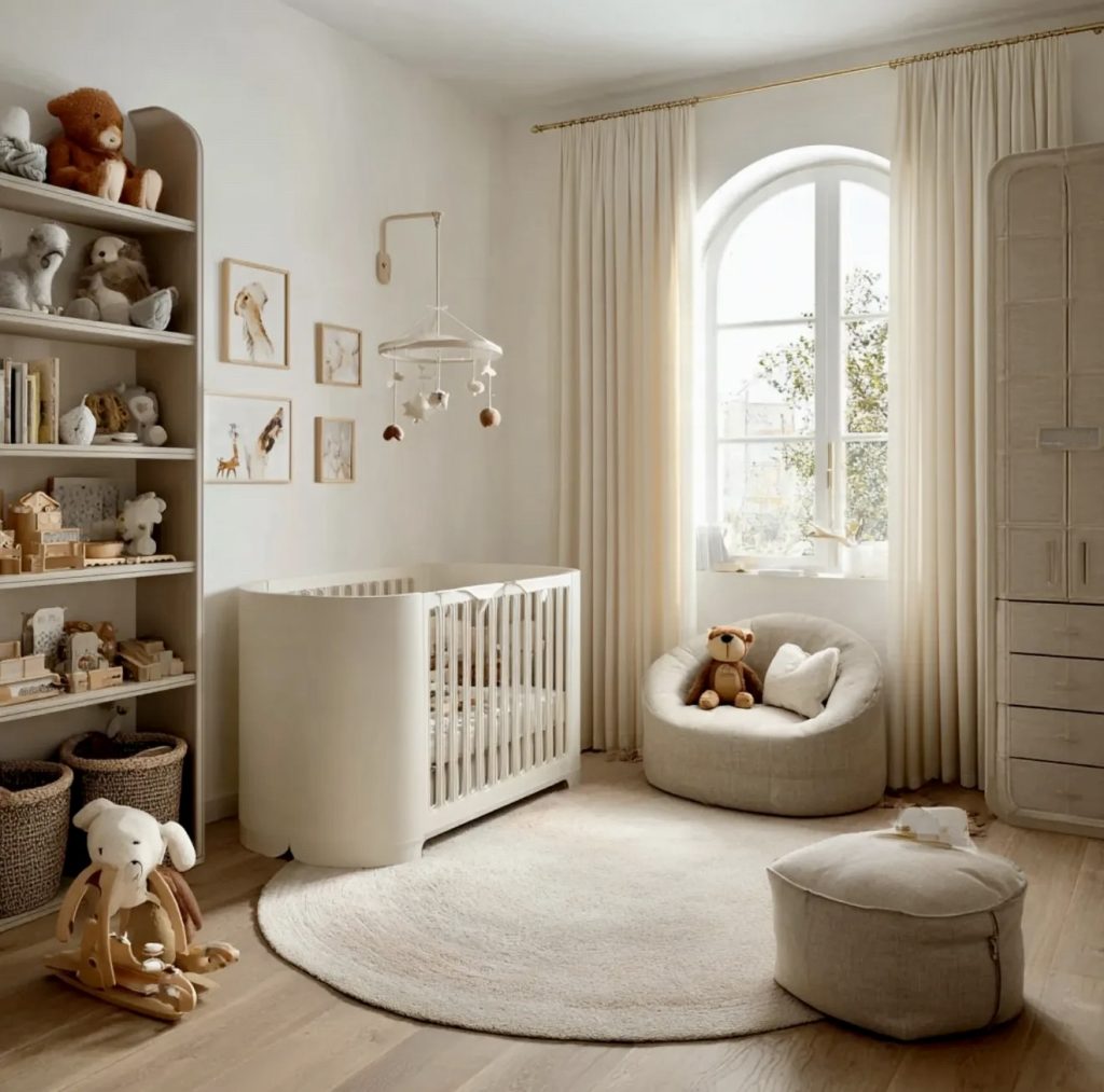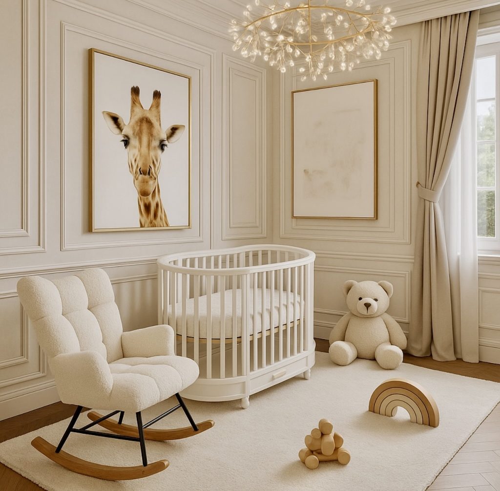 Offering a more sophisticated take on neutral design, this nursery has paneled walls and gold accents amidst a soft cream palette. Yet, the round crib and sumptuous rocker act as a cozy arena, fitting for both parent and baby. A mammoth animal portrait seems in support of whimsical or even Disney-like narratives. The room feels quite perfect as a gender-neutral or unisex nursery. Natural wood toys and softness in texture keep it cute while maintaining its sophistication. This gives credit to classical yet forward-looking nursery-ideas 2026.