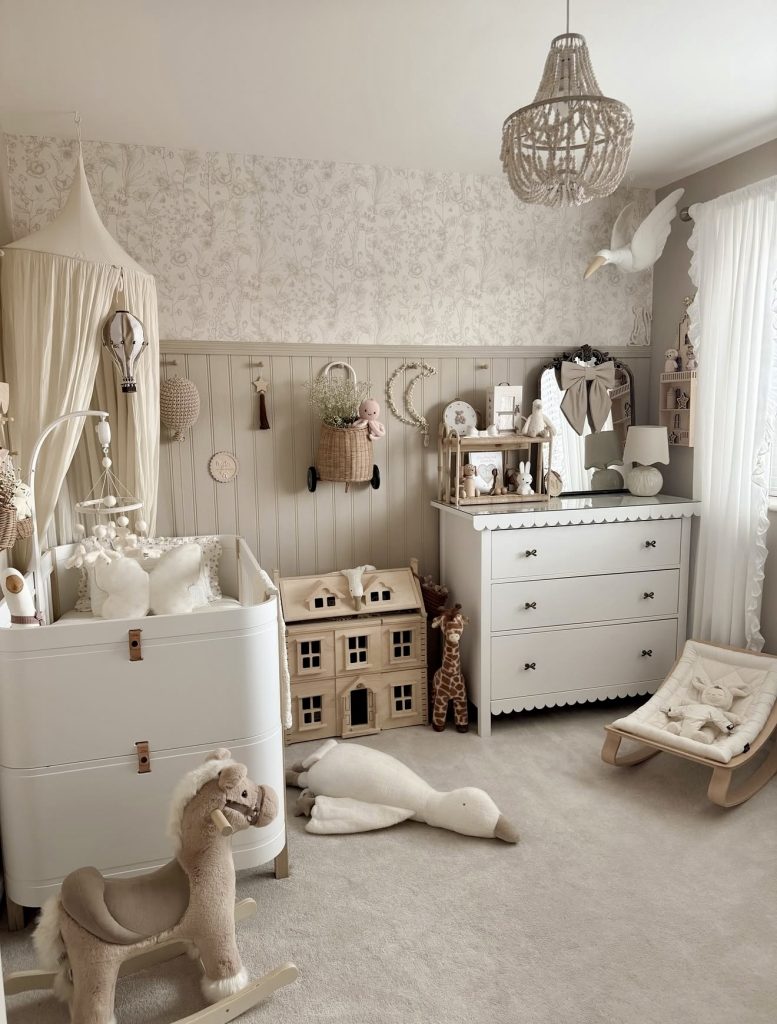 This nursery feels straight out of a fairy tale, with floral wallpaper and soft, whimsical details throughout. The soft neutral palette makes it perfect for a gender neutral space, while details like a rocking horse and plush toys keep it cute and playful. Wooden toys and woven baskets add an earthy element that balances the delicate design. The layered textiles make the room especially cozy, inviting both play and rest. Every corner feels thoughtfully styled, from the canopy crib to the scalloped dresser. This design embodies nursery ideas 2026 with its mix of tradition and imagination.