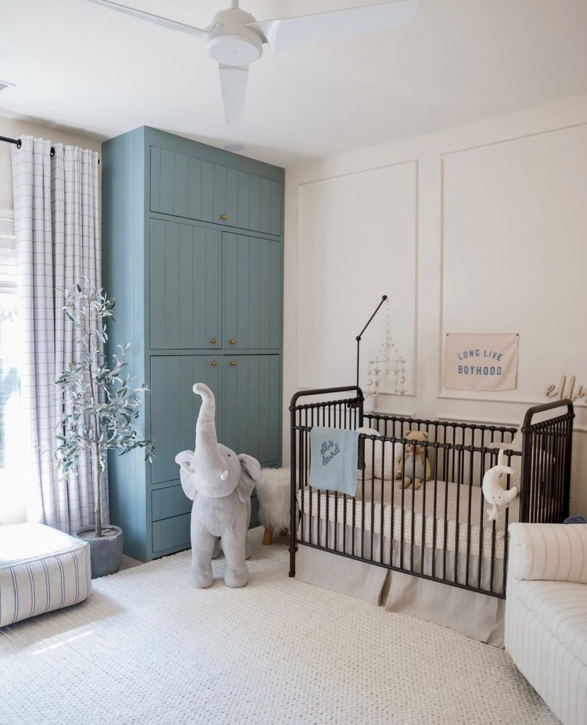 This nursery balances a sleek modern look with neutral warmth, featuring a dark crib paired with a bold blue built-in wardrobe. The striped curtains and textured rug make the space feel layered and cozy. A plush elephant adds a cute and whimsical touch, making the room inviting for play. The clean lines and uncluttered design make it adaptable as a gender neutral nursery. Soft accents of green from plants add an earthy freshness. This look works perfectly for parents seeking a calm yet unique modern style.