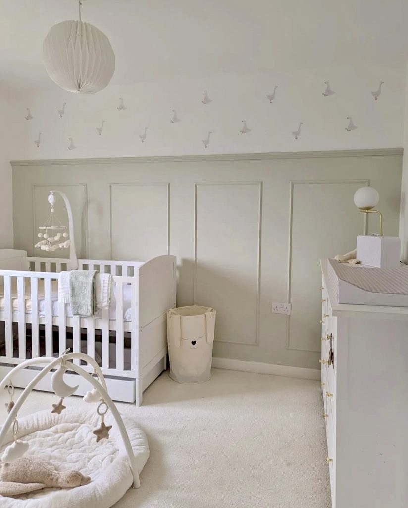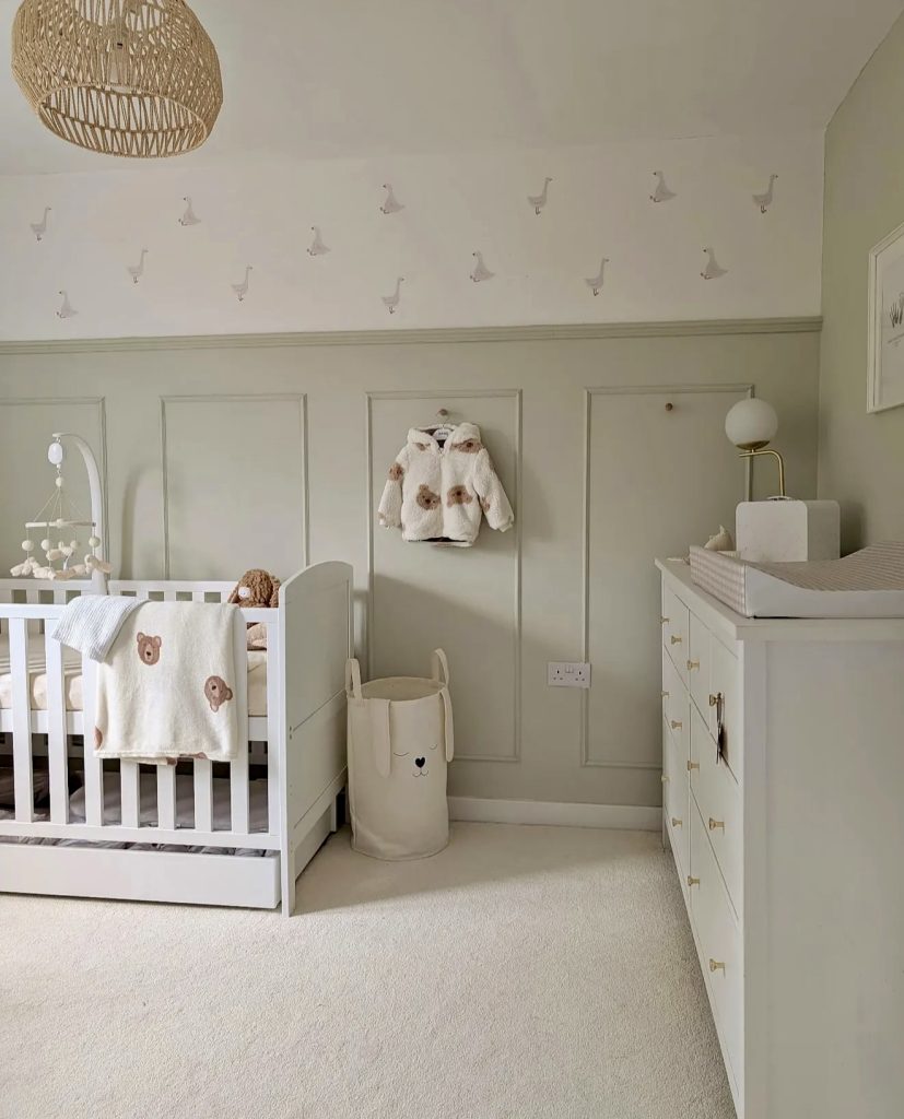 This green and white nursery embraces clean lines and minimalist charm, making it perfect for modern families who love simplicity. Panel molding adds subtle architectural interest, while playful goose wall decals bring a whimsical and cute touch to the space. The white crib, dresser, and light fixture keep the palette neutral, allowing the soft sage wainscoting to shine. A plush activity mat introduces warmth and texture, ensuring the room still feels cozy despite its minimalism. Thoughtful storage solutions, like the character-themed laundry basket, add personality without clutter. This design is ideal for those who want a gender neutral nursery that feels airy, fresh, and easy to adapt over time.
