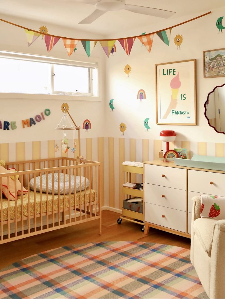 This nursery bursts with energy through its colourful details and patterned textiles. From rainbow bunting to cheerful wall decals, the space feels whimsical and cute. The striped walls and checked rug create a fun backdrop for a room full of imagination. A simple wooden crib keeps the look neutral, balancing the brighter elements. The playful mix of yellow, pink, and bold accents makes it perfect for a family that loves personality. This design shows how nursery ideas 2026 embrace both fun and practicality.