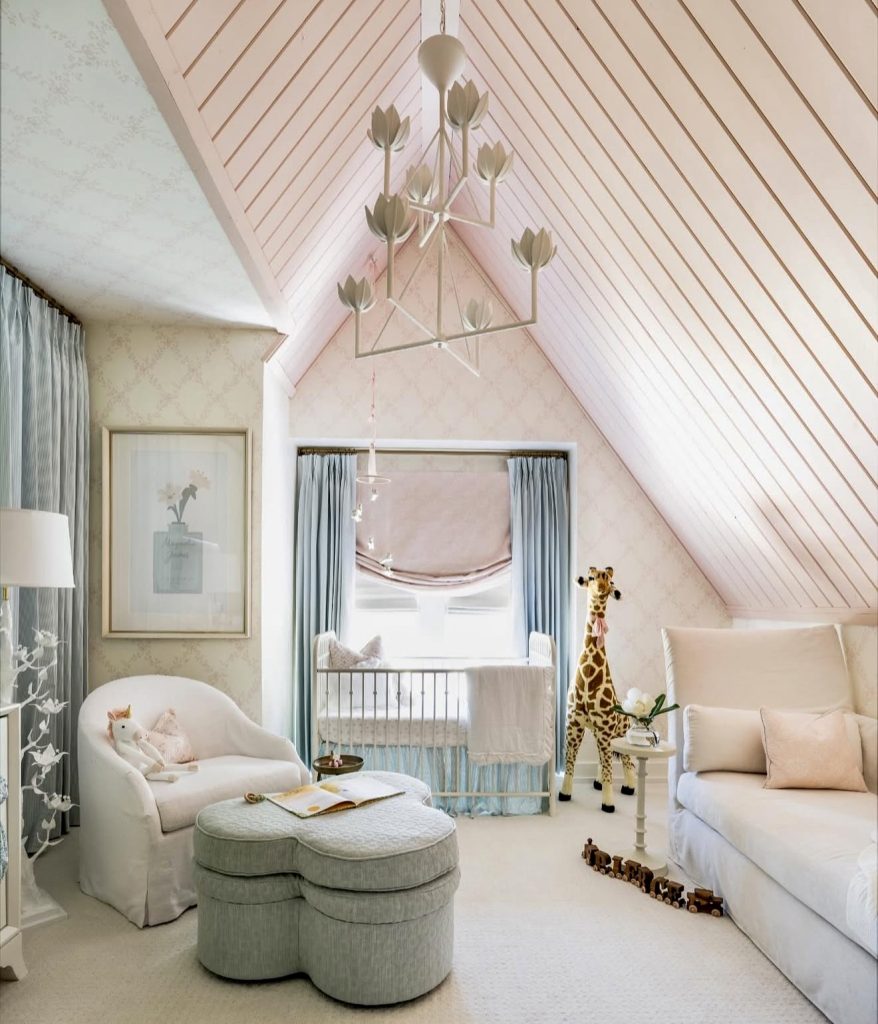 This nursery transforms an attic room into a cozy retreat with soft pastel hues. The vaulted ceiling with pink paneling feels unique and whimsical, while blue curtains add balance. A delicate chandelier and vintage-inspired furniture bring in a touch of church-like elegance. A plush giraffe and soft toys keep the design cute and child-friendly. The neutral palette ensures the space feels calming and timeless. It’s a perfect example of how to make unusual architecture work for a nursery design.