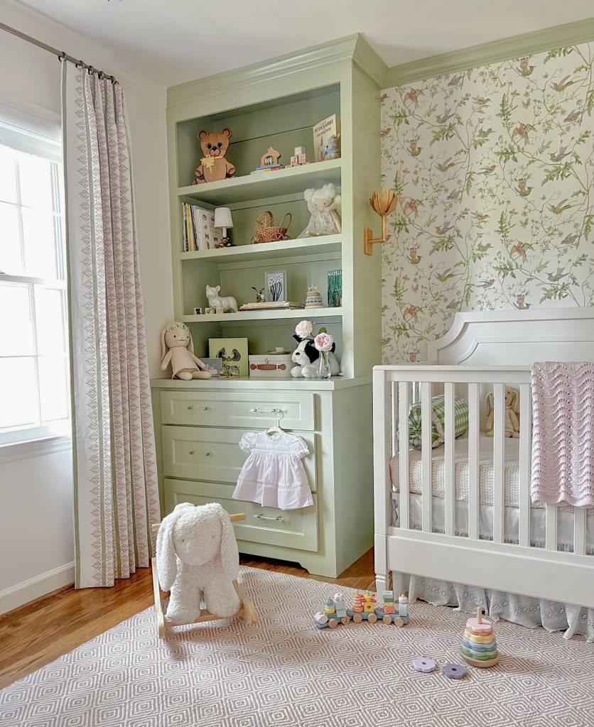 This nursery blends green tones and floral wallpaper for an earthy and natural look. The white crib and scalloped shelving create a cute, cottage-inspired charm. A rocking bunny toy and pastel blocks bring in whimsical playfulness. The overall palette is neutral, making it ideal for a gender neutral or unisex design. Light filters in beautifully, giving the room a soft and cozy atmosphere. Families who love a blend of forest-inspired calm and cheerful details will find this nursery design inspiring.