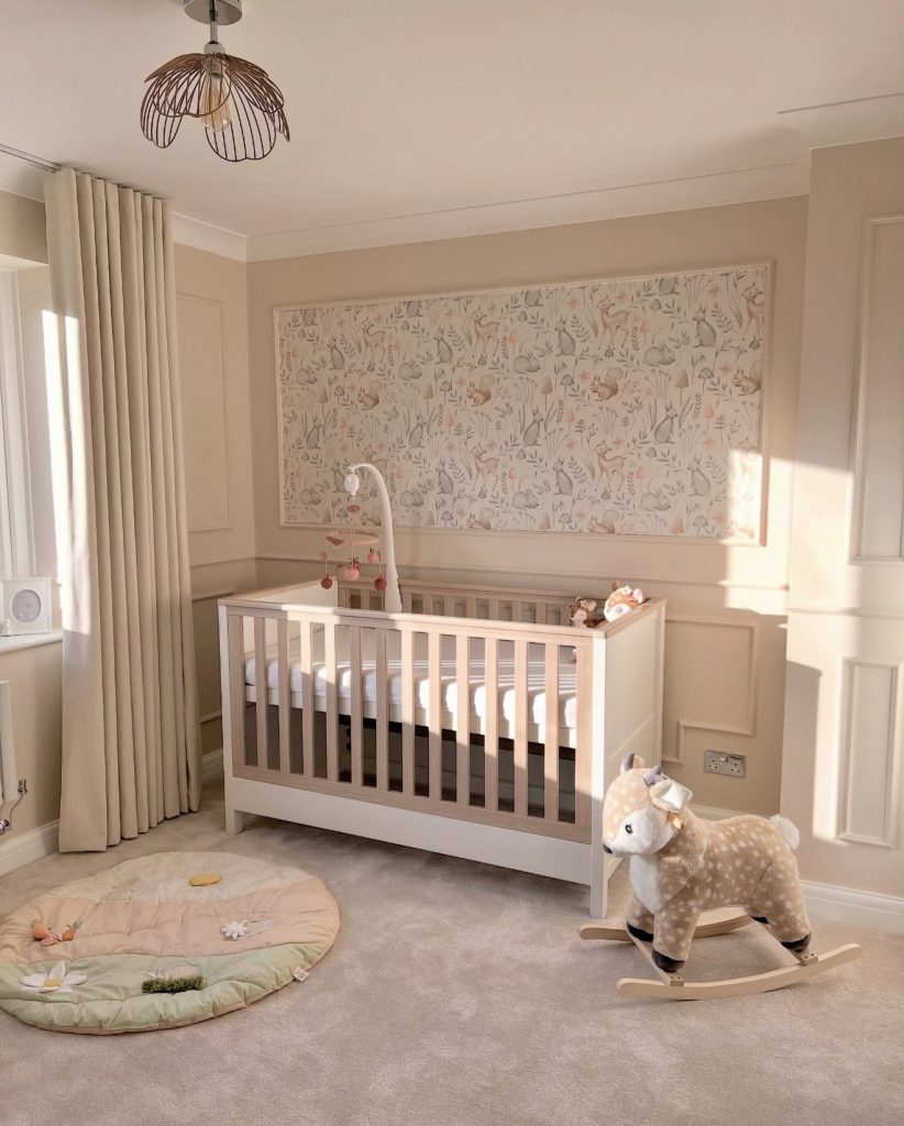 This neutral nursery exudes a calming sense of serenity, blending soft beige tones with natural textures to create a timeless look. A forest-inspired wallpaper panel framed behind the crib introduces a whimsical element without overwhelming the small space. The clean white crib and plush rocking deer give the room a cozy, storybook feel that works beautifully for a gender neutral design. Light curtains allow soft sunlight to spill in, enhancing the gentle atmosphere. The padded play mat on the floor adds both comfort and warmth, making it perfect for early playtime. This kind of design appeals to parents who love subtle elegance while keeping the nursery versatile as their child grows.