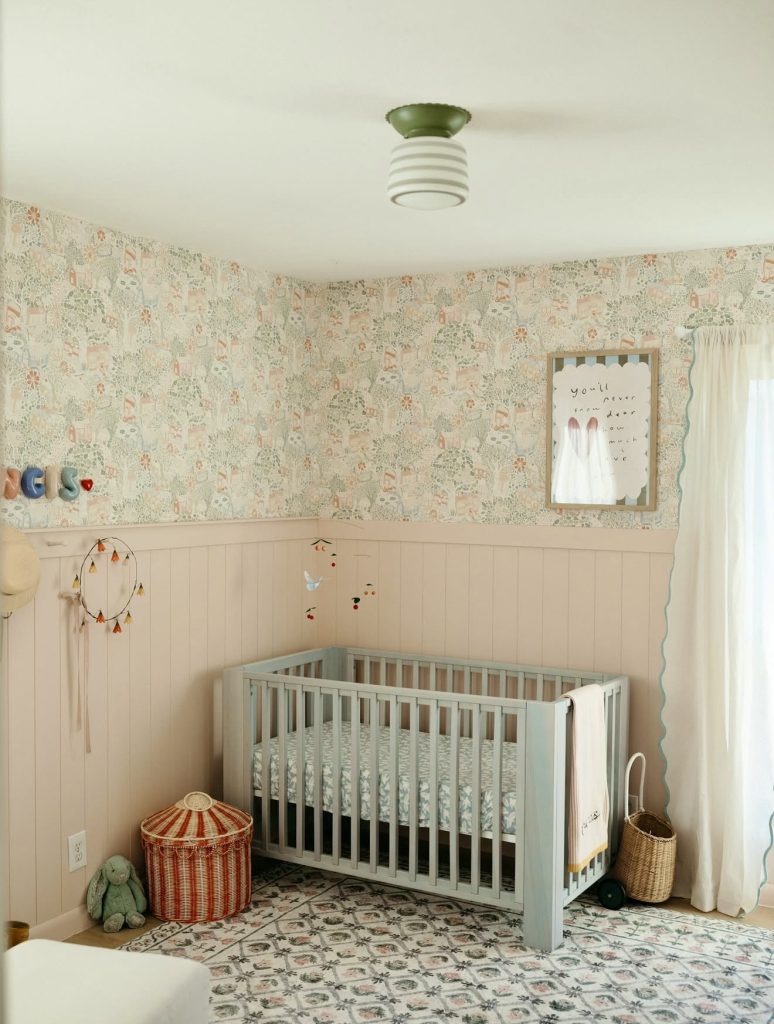 This nursery captures a colourful, whimsical spirit with its playful wallpaper filled with charming illustrations reminiscent of classic children’s storybooks. The two-tone wall treatment — wallpaper above and warm blush paneling below — brings depth to the design while keeping it gender neutral. A light blue crib adds a unique touch, gently contrasting with the earthy tones and patterned rug beneath. Natural woven accents, like the storage basket, complement the soft hues and give the room a cozy and earthy vibe. Thoughtful details like the hanging mobile and curated wall art create a layered, lived-in feeling. This space would delight families who want a forest-themed look that feels imaginative yet grounded.
