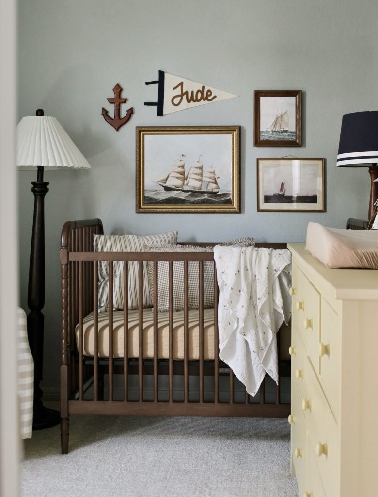 This room embraces a refined nautical theme, blending deep wood tones with vintage artwork for a look that feels both nostalgic and timeless. The rich brown crib anchors the space, while framed ship paintings and a classic anchor symbol introduce maritime personality without leaning into clichés. A soft blue wall sets the scene, creating a serene backdrop that enhances the cozy and layered feel. Striped pillows and gingham bedding add subtle pattern play, perfect for a gender neutral nursery that doesn’t rely on traditional color cues. The yellow dresser brings a cheerful pop, making the space feel warm and personal. This design would appeal to parents who love coastal aesthetics with a touch of heritage.