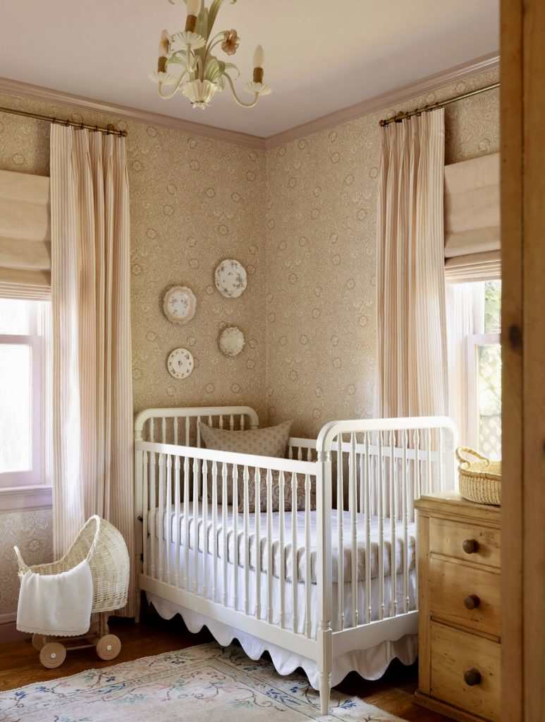 Here, a vintage-inspired nursery leans into soft earthy tones, floral wallpaper, and classic furnishings to create a timeless, welcoming space. The white crib with turned spindles pairs beautifully with the warm wood dresser, while layered textiles add to the room’s cozy atmosphere. Long pleated curtains and delicate wall plates bring a subtle nod to traditional Americana, ideal for those who love unique historical charm. Soft pink undertones in the trim and wallpaper make the space feel gentle and nurturing without being overly pink. Natural light enhances the romantic textures, giving the room a sun-washed glow that feels peaceful and inviting. This look is perfect for families seeking a neutral, cottage-inspired nursery with character.