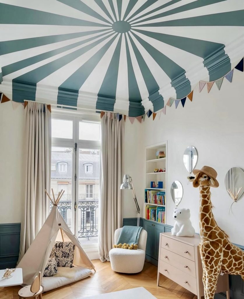 This nursery bursts with unique personality thanks to its bold, striped ceiling that mimics a circus tent — instantly creating a whimsical and imaginative atmosphere. The soft green and white palette keeps the space balanced, ensuring that the playful ceiling doesn’t overwhelm the room. A cozy reading nook with a small teepee adds a cozy retreat for story time, while the oversized giraffe wearing a hat brings a touch of humor and charm. Natural light floods the room, highlighting the colourful bunting and subtle architectural details. The furniture stays neutral, allowing the ceiling to shine as the hero of the design. This is a perfect example of how a single bold element can set the tone for a gender neutral nursery that feels magical.