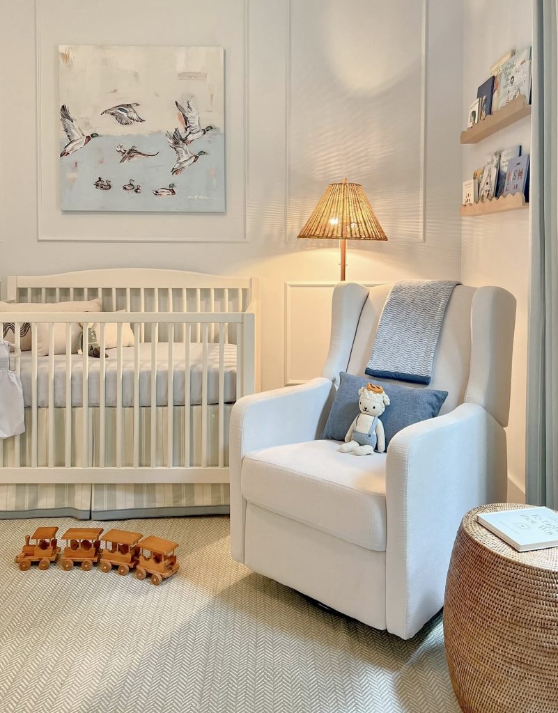This neutral nursery celebrates simplicity and nature with its serene palette and soft textures. A large painting of flying ducks becomes the central art piece, adding a subtle whimsical and forest element to the otherwise minimal space. The clean white crib and plush rocking chair set the tone for a cozy, comfortable atmosphere ideal for quiet moments. Light wood accents and a woven side table bring in organic warmth, while the striped crib skirt and blanket introduce a delicate touch of pattern. Everything is arranged to feel airy and uncluttered, making it perfect for small or tiny rooms. It’s a beautiful example of how minimal design can still feel personal and comforting.