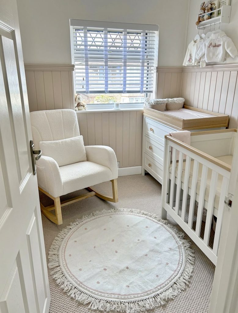 This nursery shows how tiny spaces can be both functional and beautiful when thoughtfully designed. The soft neutral palette of beige and white makes the room feel larger, while vertical paneling adds texture without crowding the walls. A simple rocking chair and round rug create a warm cozy corner, proving that even compact layouts can be inviting. Clever storage solutions, like the compact changing table and hanging shelf, keep everything organized while maintaining the aesthetic. Natural light through the window brings freshness and balance to the space. This design is ideal for parents who want a clean, timeless look that adapts as their child grows.