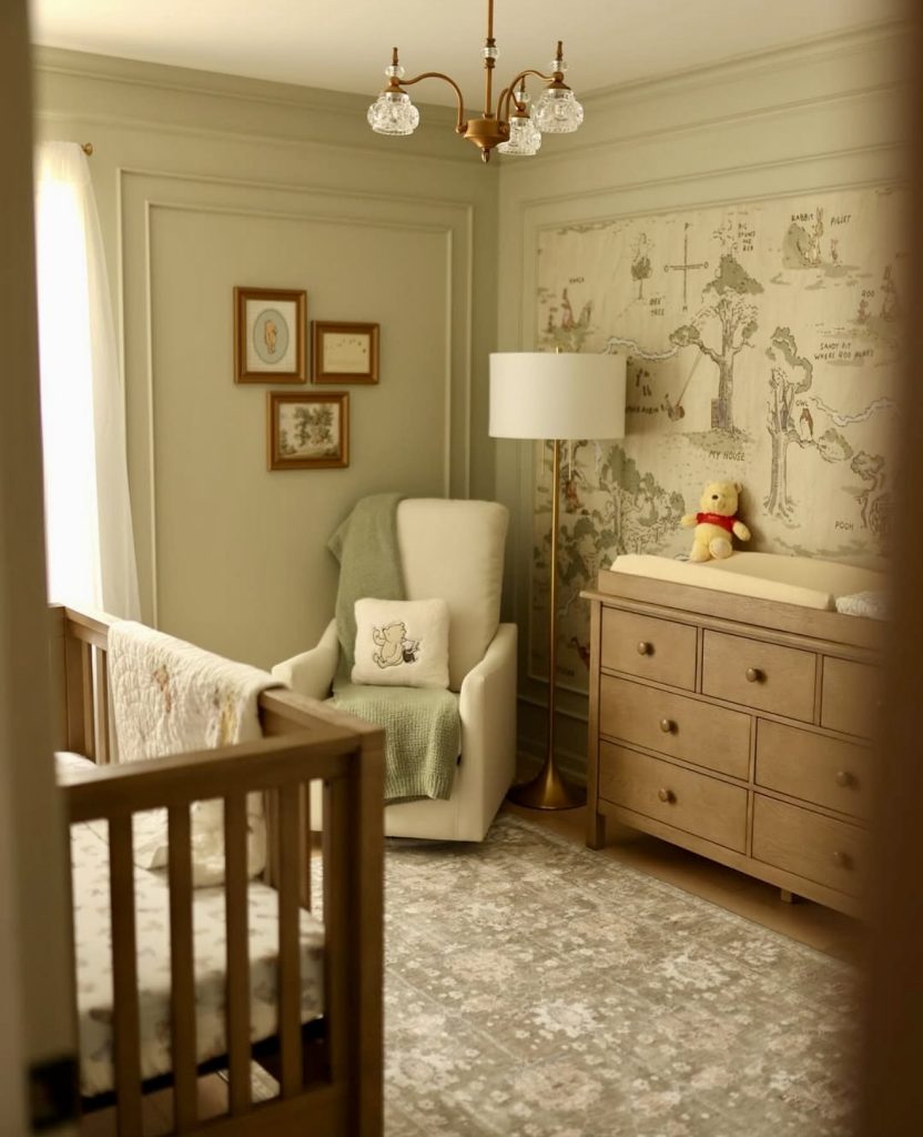 This nursery brings Winnie the Pooh storybook charm to life with its soft sage-colored walls and vintage-style wall mural. The warm wood tones of the crib and dresser give it a sort of earthy, very cozy ambiance. A plush chair and layered textiles are there for comfort during long evening feedings plus some cute embroidered detail on the cushions. The ambiance feels neutral, which means a wonderful unisex or gender-neutral design. A few hits of classic such as framed art and a golden chandelier lift the whole look. It’s a space that feels both timeless and whimsical, essentially for a family who adore classic children’s tales.