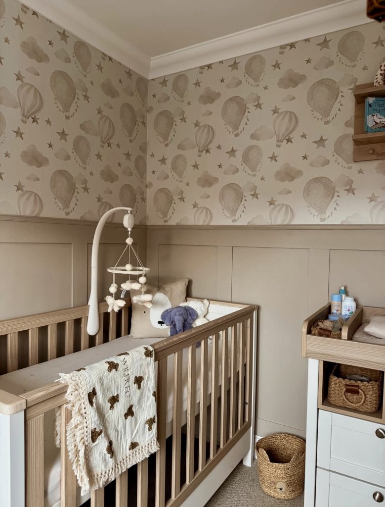 This design captures whimsy with the hot-air balloon wallpaper in soft creams and beiges. The neutral palette keeps the space timeless and well-suited for a unisex nursery. A cozy crib setup with textured blankets and plush toys makes for a cute welcome. Woven baskets and smart storage add practicality while maintaining that earthy vibe. The playful wall design could even be a gateway to a Disney-esque adventure theme for storytelling. This nursery is for parents who want their baby room to inspire imagination.