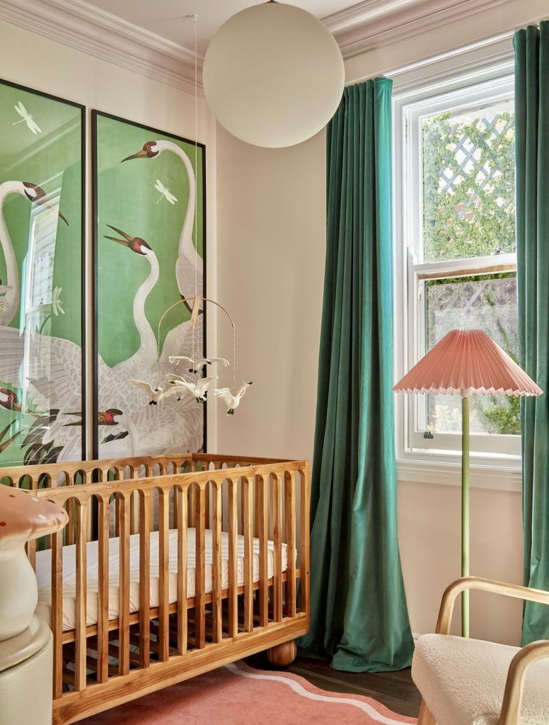 This nursery boldly embraces lime green draperies with complementary wall art featuring cranes in flight. The look is colourful, merging different shades of pink and green to achieve a lively yet mature effect. A wooden crib grounds the room with warm natural hues, and modern lighting adds a distinctive twist. The feel is ever-so-slightly whimsical, with kinetic energy from crane mobiles and playful textures. Any parent who’d rather live in colour will find this little gem hugely inspirational. Here’s some proof that nursery ideas for 2026 certainly need not be something muted to feel welcoming and cozy.