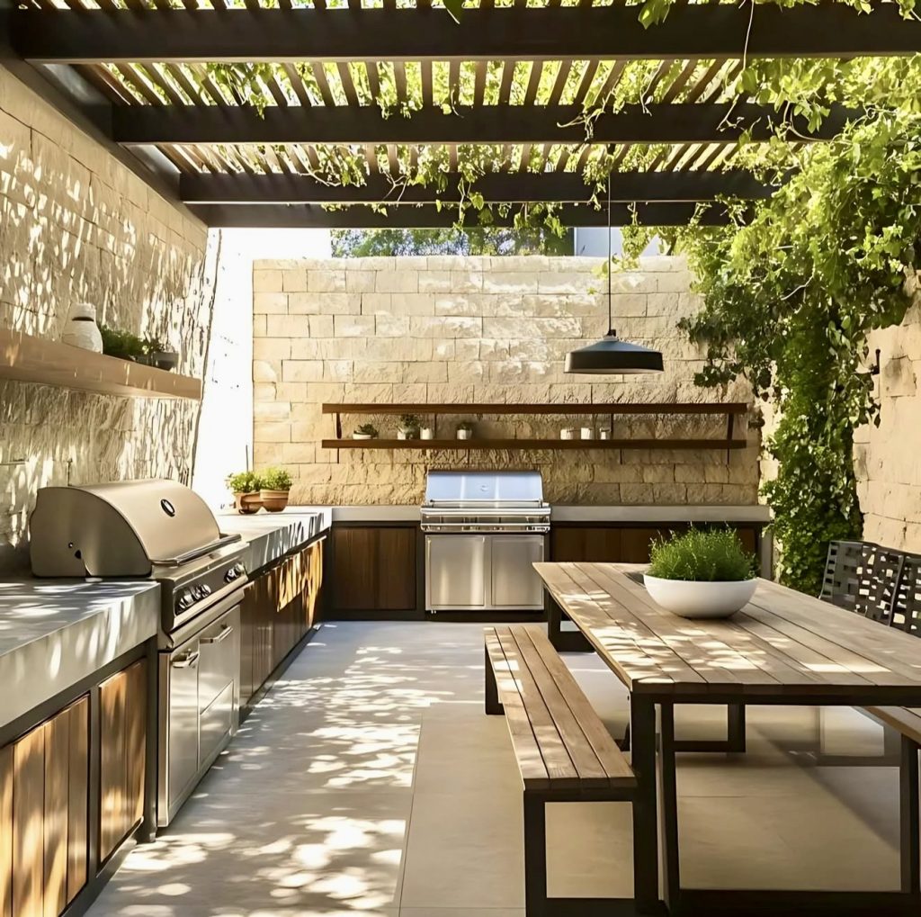 This design embraces everything homeowners want in 2026: a breezy pergola with climbing greenery, natural stone walls, and a streamlined layout grill area that keeps prep, cooking, and serving in one intuitive line. The long concrete counters and warm wood cabinetry create a grounded atmosphere, while the bench-style dining table brings in that casual, neighbor-over-for-dinner energy Americans love. It’s a beautiful example of how a semi-enclosed, open-air kitchen can feel both modern and timeless, offering practical ideas for patios where shade, airflow, and style all matter equally.