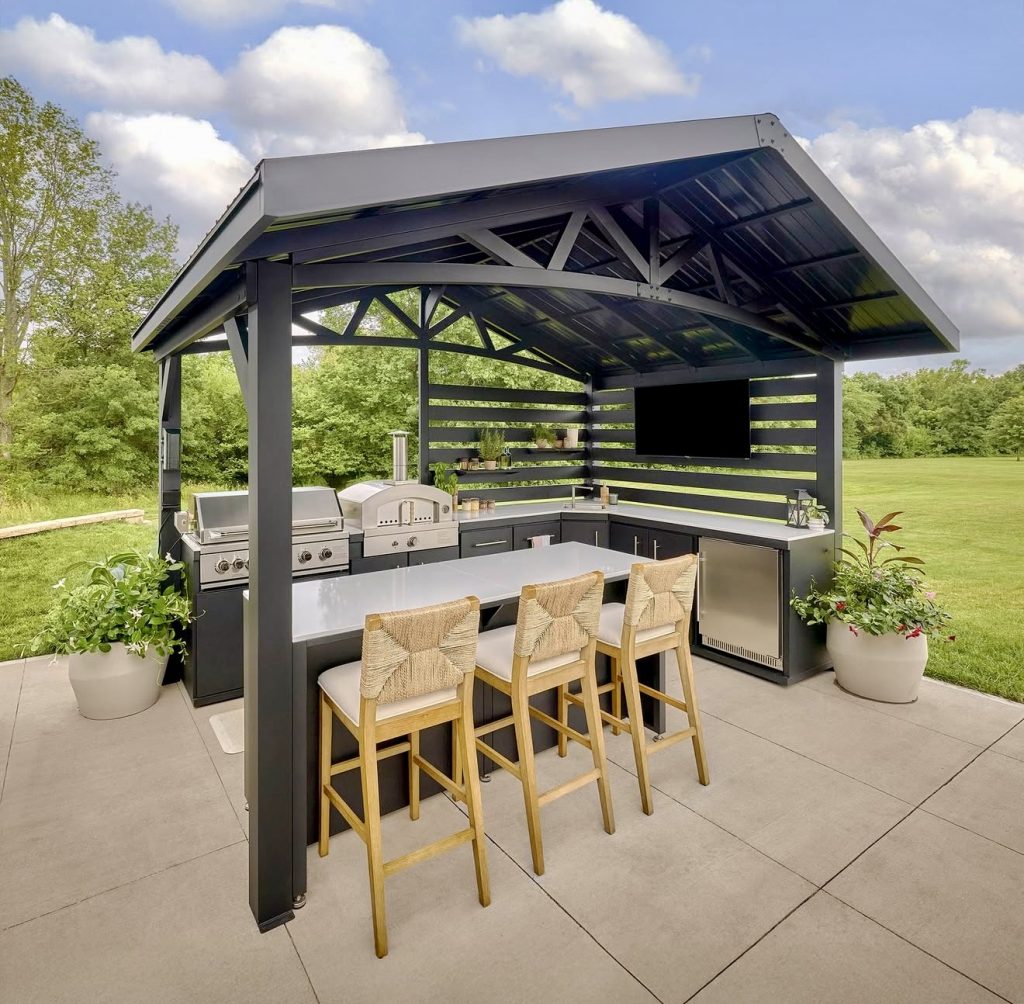 This striking pavilion-style kitchen shows how a bold structural frame can transform a simple patio into a full entertainment zone, complete with shade, airflow, and a smartly arranged layout grill area. The slatted back wall creates privacy without blocking breezes, while the bar seating offers a natural gathering point for guests during weekend cookouts. With its integrated appliances, compact plans, and multifunctional counter space, this setup is packed with ideas for homeowners considering an open-air structure that feels architectural but still approachable. The combination of weather-resistant steel, natural textures, and thoughtful spacing makes it a strong example of modern outdoor living done right.