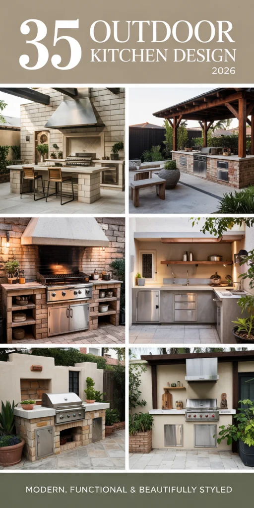 This design captures the very spirit of outdoor living in 2026—flexibility. The retractable louvered roof, glass walls, and sturdy brickwork turn this into an enclosed entertaining station that feels as functional as a high-end indoor chef’s kitchen. What stands out is the thoughtful blend of materials: brick for warmth, stone countertops for durability, and a sleek metallic frame that makes the space feel architectural rather than temporary. This setup works particularly well for anyone living in a region where weather changes fast, and it shows that a backyard doesn’t have to be large to feel elevated. Add a few high-back bar stools, and now it’s a space for lingering conversations, casual wine nights, or family dinners. Design experts often say outdoor kitchens should feel like extensions of the home—and this build proves the point beautifully.