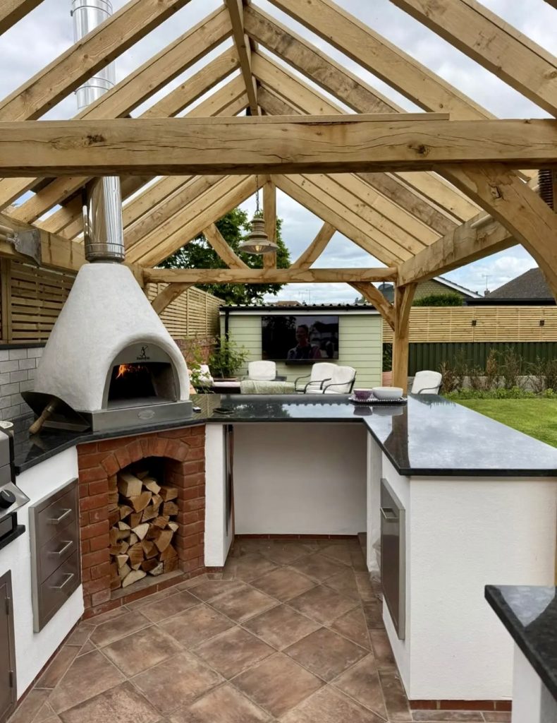 11. Timber-Framed Outdoor Kitchen With Corner Pizza Oven
