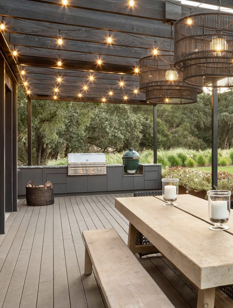 This softly lit outdoor kitchen embraces a moody, nature-forward palette under a wide pergola with warm string lights that make the entire deck glow at dusk. The long, linear layout of the grill area maintains a clean, modern profile, while the chunky wood dining table brings a grounded, farmhouse touch to the scene. With layered lighting, durable composite decking, and a peaceful garden view, this setup offers excellent inspiration for homeowners who want an open-air kitchen that transitions seamlessly from relaxed family dinners to elevated evening gatherings.