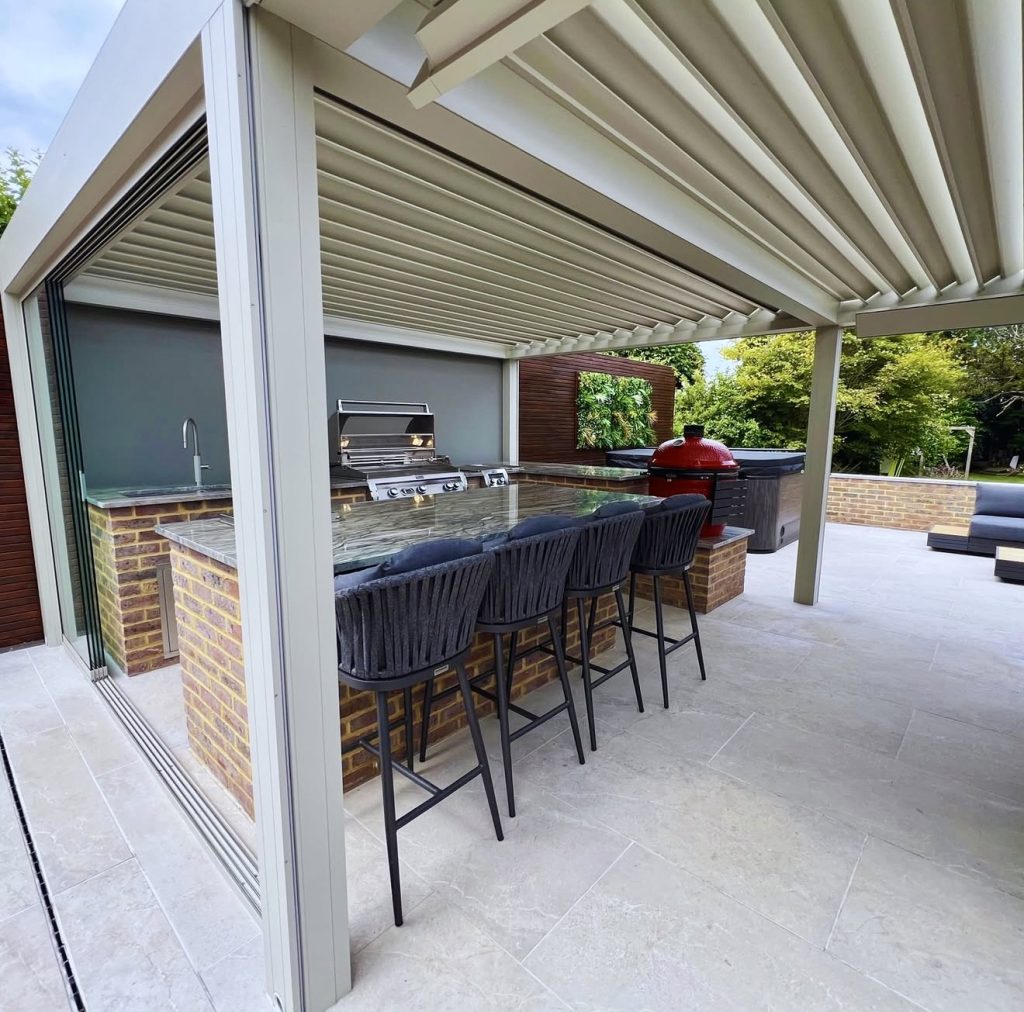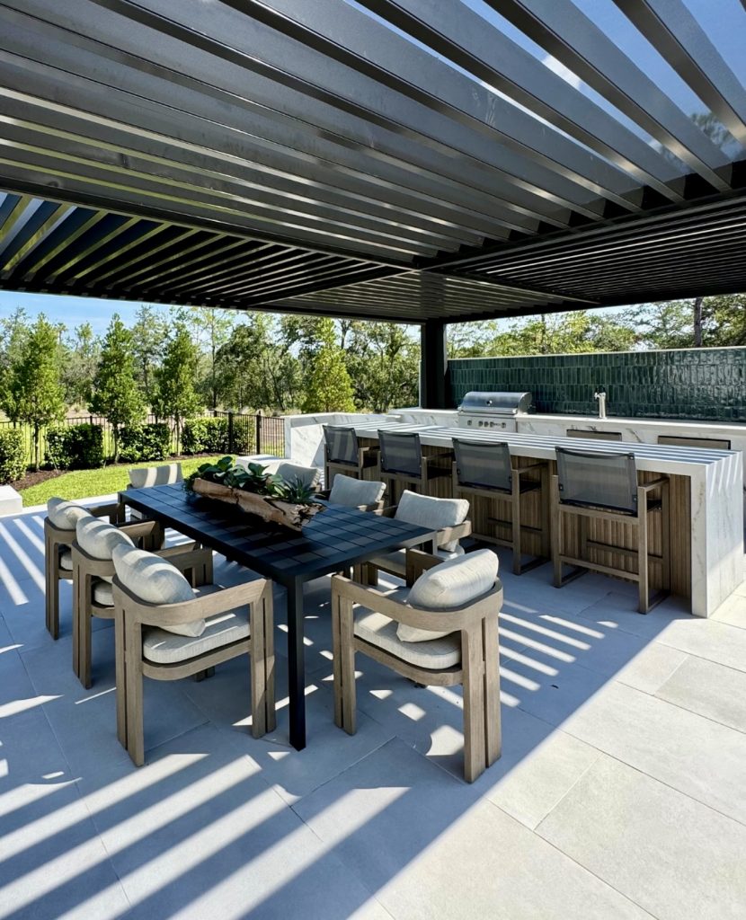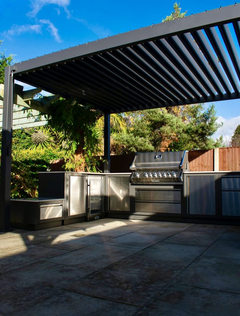 14. Sleek Steel Louvered Pergola With Modern Appliances