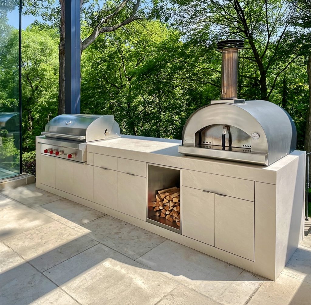 This refined outdoor kitchen blends sculptural stonework with top-tier cooking flexibility, pairing a premium grill with a statement pizza oven in a long, uninterrupted layout grill area plan. The clean lines, pale surfaces, and built-in firewood niche give the whole space a serene, spa-like feeling, while the surrounding trees create a natural canopy that enhances the open-air experience. It’s an ideal setup for homeowners looking for luxury without unnecessary ornamentation—simple, durable, beautifully composed, and packed with modern functionality.