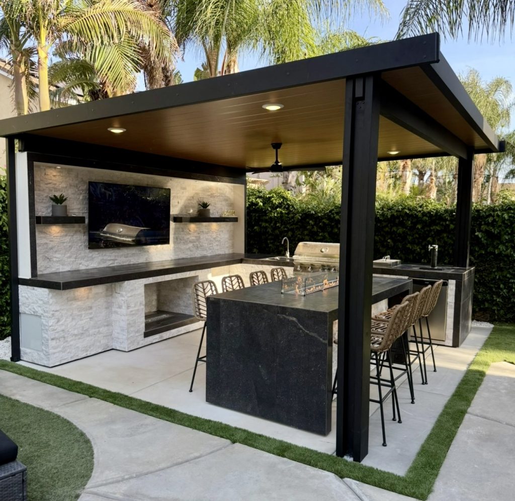 This sleek outdoor pavilion merges cooking, lounging, and entertainment under one minimalist covered structure that feels both polished and inviting. The dark stone island anchors the layout, offering generous bar seating for family and friends, while the built-in TV wall and soft accent lighting make the space ideal for game nights or weekend gatherings. With its clean geometry and integrated grill system, this design delivers strong inspiration for homeowners who want a more elevated, contemporary take on the patio BBQ area without sacrificing comfort or warmth.