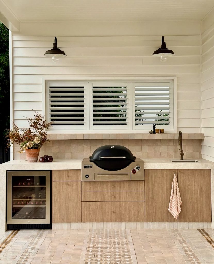 This light-filled outdoor kitchen embraces a coastal farmhouse aesthetic, pairing pale wood cabinetry with creamy stone counters and patterned tile for a look that feels effortless and serene. The compact layout grill area is neatly organized with a built-in beverage fridge, creating a functional flow in a small space while still offering plenty of prep room. Subtle details—like the mixed tile flooring and shuttered window—add a layer of personality that fits beautifully into the 2026 trend toward soft, textural, quietly luxurious outdoor spaces, offering approachable ideas for both U.S. and UK homes.