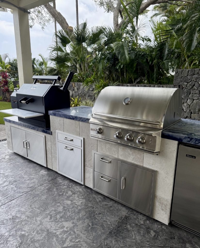 This rugged outdoor kitchen blends textured stone, marine-grade steel cabinetry, and dual cookers for a setup that’s made to handle serious weekend grilling. The extended layout grill area plan offers ample surface room for prepping, plating, and hosting, while the lush tropical landscaping softens the hard materials and brings a relaxed, resort-style vibe. For homeowners considering long-lasting plans and weatherproof materials, this space offers excellent inspiration, especially for those who want a balance of performance and natural beauty.