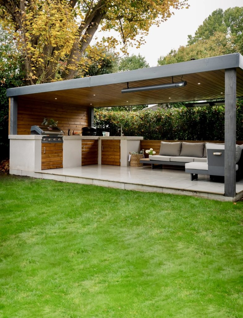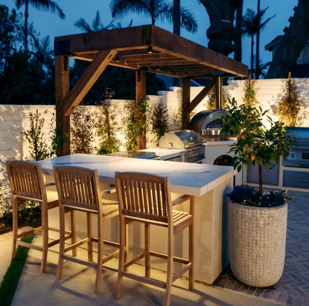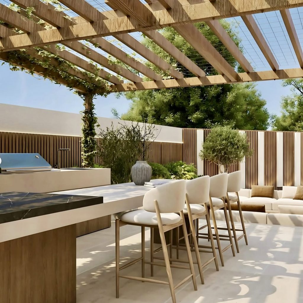 This design captures the essence of luxe pergola living in 2026: architectural shade, open airflow, and multiple seating zones that make the patio work all day long. The marble-inspired countertop brings a refined elegance, while the wood seating introduces warmth and texture. If you’ve ever wanted your backyard to feel like an outdoor dining room, this is the blueprint. The kitchen is aligned against one wall to maximize circulation and views of the garden, a layout recommended by many landscape designers when working in a rectangular or expansive yard. It’s the perfect mix of sophisticated and cozy, and it shows just how seamless an outdoor kitchen and lounge setup can be.